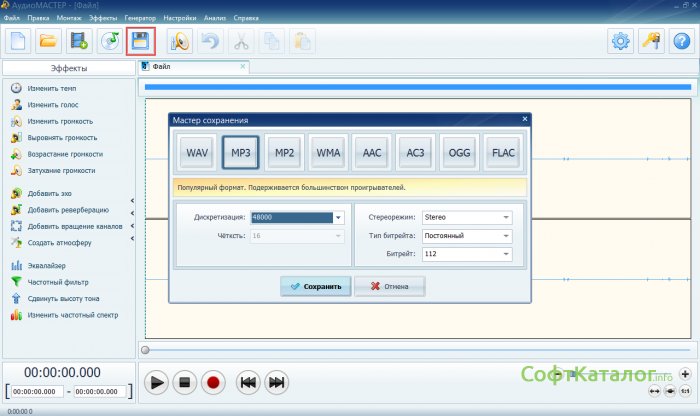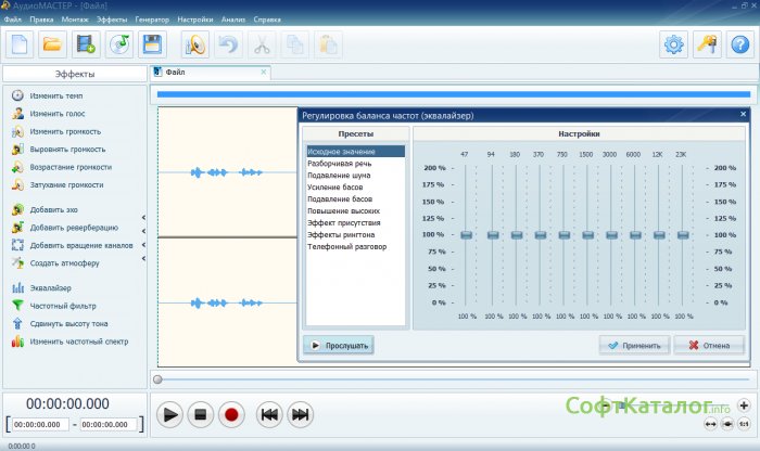 После того как программа записала ваш голос, она предложит вам отредактировать файл. Вы сможете добавить эхо или реверберацию, а также наложить разные эффекты. Есть возможность наложить ваш эквалайзер либо выбрать предустановленный.
