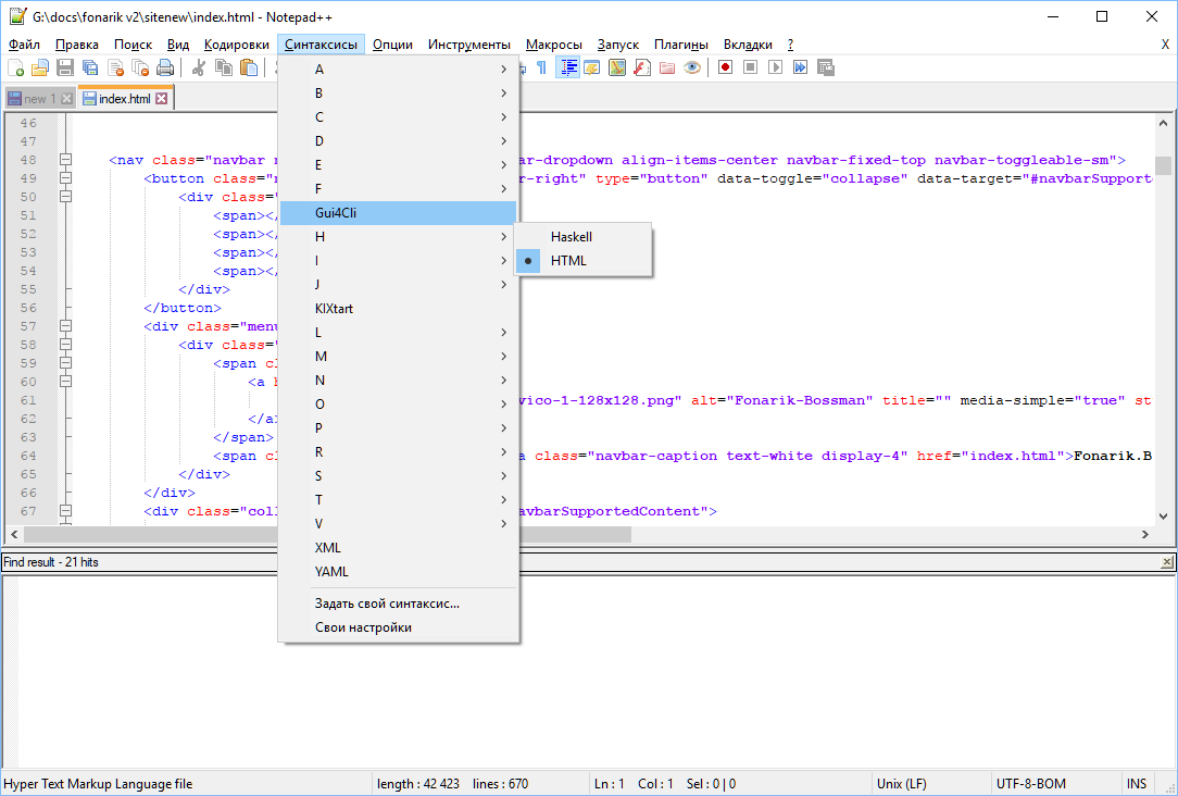 Notepad++ - это популярный текстовый редактор с открытым исходным кодом для Windows, поддерживающий большое количество языков программирования, подсветку синтаксиса и разметки. Используется для создания странниц интернет-сайтов. Данный редактор текстовых файлов по функциональности и удобству применения значительно превосходит Блокнот, входящий в стандартный пакет Windows.